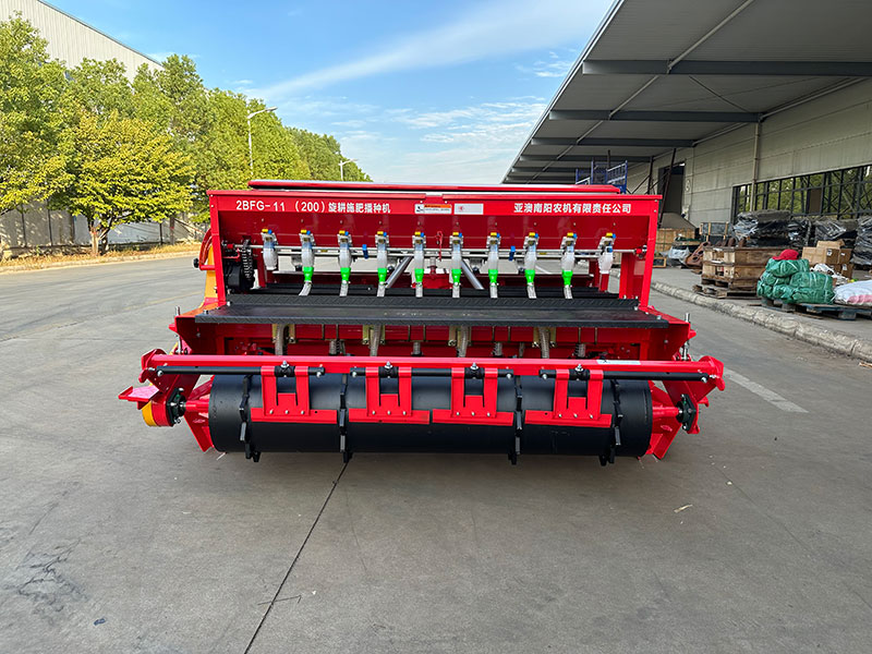2BFG系列旋播機(jī)的耕作部件是由動力驅(qū)動其刀軸旋轉(zhuǎn),使刀片對土壤進(jìn)行切削并將需播種區(qū)域的土壤切下后拋,與此同時由鎮(zhèn)壓輥驅(qū)動排肥器排出肥料落入整體排肥槽,撒入前邊未耕地面,由旋耕機(jī)工作時攪入土層,由鎮(zhèn)壓輥驅(qū)動后面小麥排種器,排出種子經(jīng)前后錯行排列,寬幅圓盤開溝器按一定農(nóng)藝要求插入土層,并被落下的碎土覆蓋,一次完成開溝、滅茬、(整地)、施肥、播種、覆土、 鎮(zhèn)壓等多項農(nóng)藝要求。