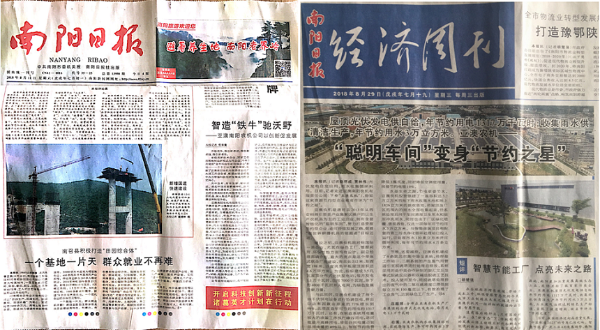 從智能制造到清潔生產(chǎn)、節(jié)能減排,一月內(nèi)《南陽日報》于8月11日、、8月29日連續(xù)兩次報道亞澳農(nóng)機(jī),河南衛(wèi)視《新聞聯(lián)播》聯(lián)動報道。