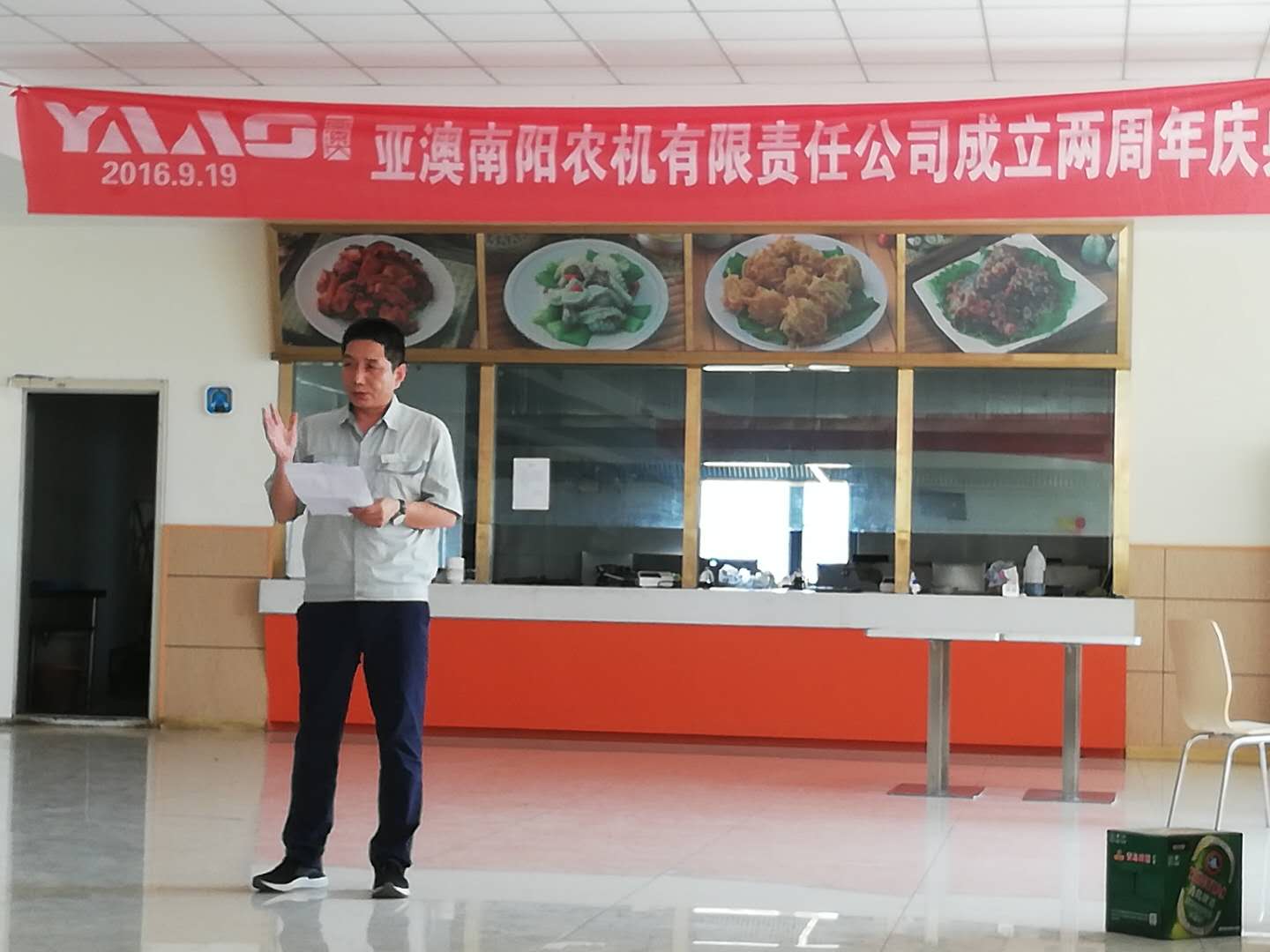 中秋佳節(jié)至,周年慶歡喜。2018923日,亞澳南陽農(nóng)機(jī)有限責(zé)任公司開業(yè)兩周年慶典暨歡度中秋佳節(jié)活動(dòng)在公司餐廳隆重舉行,因當(dāng)天有生產(chǎn)任務(wù),在不耽誤生產(chǎn)及各部門班組的全力配合下,慶典活動(dòng)在中午12:00順利開始。