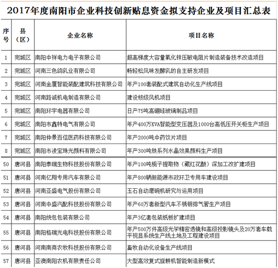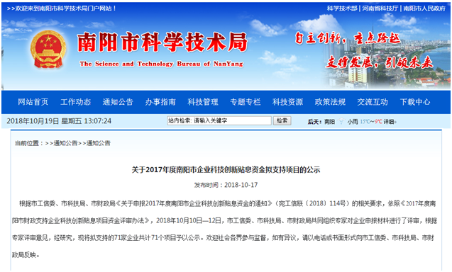 根據(jù)市工信委、市科技局、市財(cái)政局《關(guān)于申報(bào)2017年度南陽(yáng)市企業(yè)科技創(chuàng)新貼息資金的通知》(宛工信聯(lián)〔2018114號(hào))的相關(guān)要求,依照《2017年度南陽(yáng)市財(cái)政支持企業(yè)科技創(chuàng)新貼息項(xiàng)目資金評(píng)審辦法》,20181010日—12日,市工信委、市科技局、市財(cái)政局共同組織專家對(duì)企業(yè)申報(bào)材料進(jìn)行了評(píng)審,根據(jù)專家評(píng)審意見,經(jīng)研究,現(xiàn)將擬支持的71家企業(yè)共計(jì)71個(gè)項(xiàng)目予以公示。歡迎社會(huì)各界參與監(jiān)督,如有異議,請(qǐng)以電話或書面形式向市工信委、市科技局、市財(cái)政局反映。