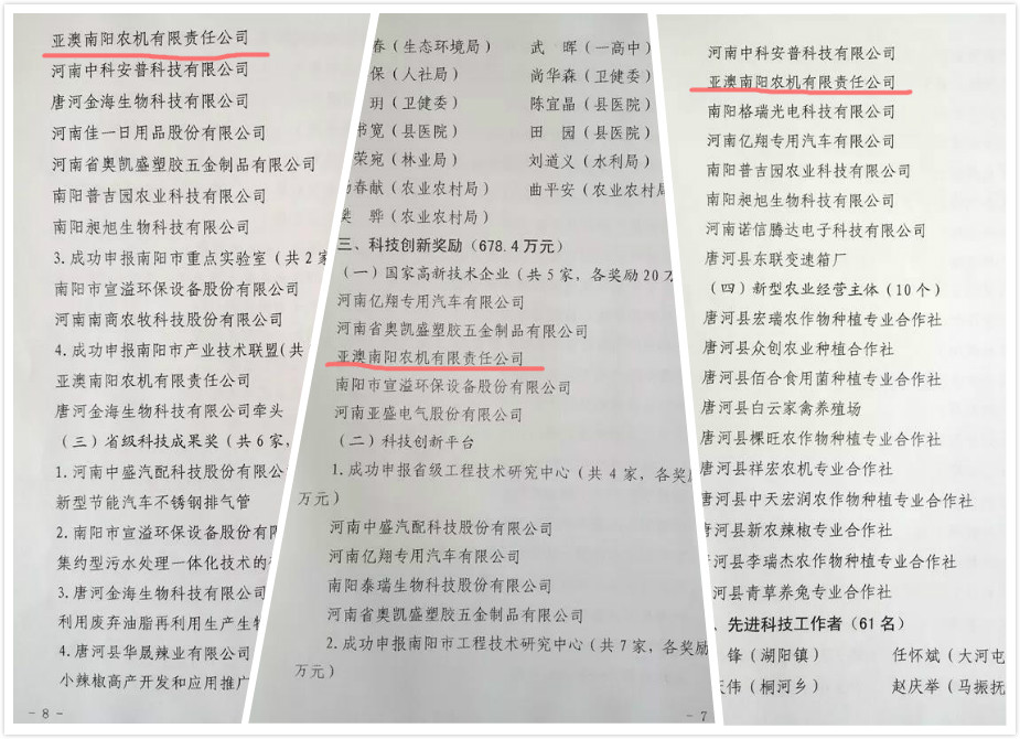 亞澳農(nóng)機(jī)共獲得政府獎勵35萬元。包括成功申報(bào)國家高新技術(shù)企業(yè)20萬元獎勵、市級工程技術(shù)研究中心5萬元獎勵、南陽市產(chǎn)業(yè)技術(shù)聯(lián)盟10萬元獎勵10萬元。