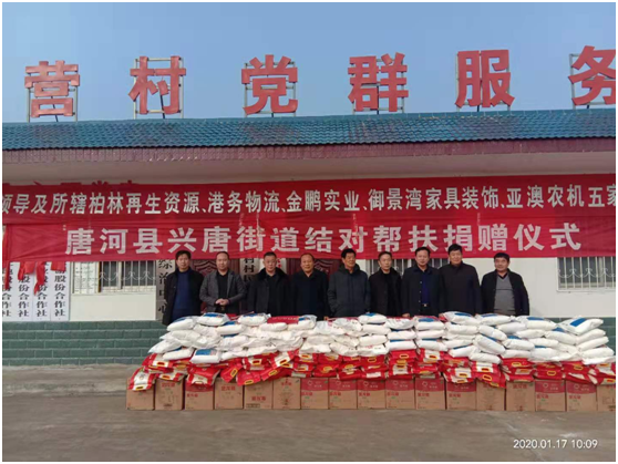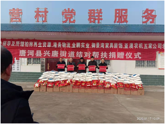 捐贈(zèng)儀式上產(chǎn)業(yè)集聚區(qū)黨委書(shū)記劉清文、主任李國(guó)營(yíng)代表興唐街道黨委、政府向五家企業(yè)的義舉表示感謝。他指出,以亞澳農(nóng)機(jī)為首的這五家公司,在完成自身企業(yè)負(fù)責(zé)包片貧困村脫貧的基礎(chǔ)上,還能再拿出現(xiàn)金3000元捐資扶貧,將自己的社會(huì)責(zé)任意識(shí),由助力脫貧攻堅(jiān),走向現(xiàn)在回饋社會(huì)。代表著我縣企業(yè)經(jīng)營(yíng)由起步走向成熟。他希望廣大困難群眾正確面對(duì)暫時(shí)的困難,樹(shù)立戰(zhàn)勝貧困、走出困境的信心和勇氣,發(fā)揚(yáng)自力更生、艱苦奮斗的精神,不等不靠,在黨委、政府和社會(huì)各界的支持和幫助下,以自身的努力和實(shí)干來(lái)化解生產(chǎn)、生活中的各種困難,為構(gòu)建美麗和諧的新唐河作出自己的貢獻(xiàn)。