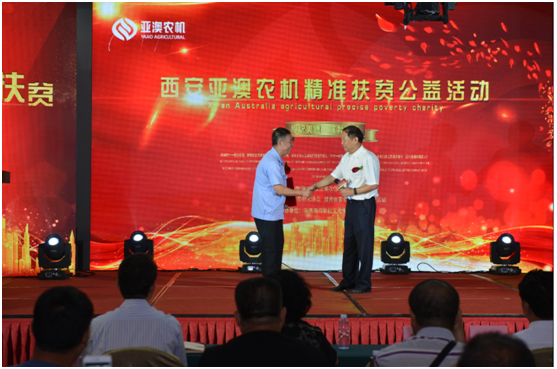 開機儀式上,中國農(nóng)機化協(xié)會還就“甘肅省蘭州市永登縣”精準(zhǔn)扶貧工作給予亞澳高度的認可。永登縣團莊村屬干旱貧困山區(qū),全村現(xiàn)有7個村民小組,421戶、1696人。近年來,幫扶單位先后捐贈了30多臺(套)特色農(nóng)機具,但仍缺少大中型農(nóng)機具,農(nóng)機化服務(wù)能力不足,不能滿足農(nóng)業(yè)生產(chǎn)需求。此次中國農(nóng)業(yè)機械化協(xié)會聯(lián)合亞澳公司等有關(guān)單位向團莊村捐贈價值40多萬元農(nóng)業(yè)機械,必將對團莊和周邊鄉(xiāng)村農(nóng)業(yè)和農(nóng)村經(jīng)濟發(fā)展、全面建設(shè)小康社會起到很大地推進作用。