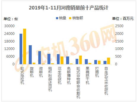 2019年1-11月,上榜河南用戶購(gòu)機(jī)量前十的農(nóng)機(jī)產(chǎn)品如下圖所示,輪式拖拉機(jī)、旋耕機(jī)、微耕機(jī)等10種農(nóng)機(jī)合計(jì)購(gòu)買(mǎi)力接近8.5萬(wàn)臺(tái),占了河南農(nóng)機(jī)總銷(xiāo)量的約80%,對(duì)這10類(lèi)農(nóng)機(jī)的購(gòu)機(jī)支出達(dá)43.3億元。