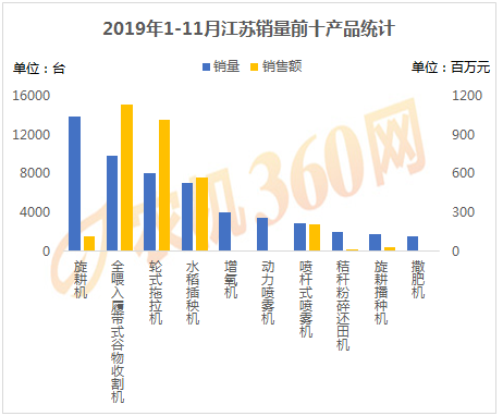 2019年1-11月,上榜江蘇用戶購(gòu)機(jī)量前十的農(nóng)機(jī)產(chǎn)品如下圖所示,旋耕機(jī)、全喂入履帶式谷物收、輪式拖拉機(jī)等10種農(nóng)機(jī)合計(jì)購(gòu)買(mǎi)力5.45萬(wàn)臺(tái),是江蘇農(nóng)機(jī)銷(xiāo)量的85.35%,對(duì)這10類(lèi)農(nóng)機(jī)的購(gòu)機(jī)支出達(dá)31.02億元。