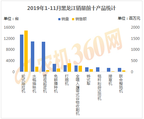 2019年1-11月,上榜黑龍江用戶購(gòu)機(jī)量前十的農(nóng)機(jī)產(chǎn)品如下圖所示,輪式拖拉機(jī)、水稻插秧機(jī)、埋茬起漿機(jī)等10種農(nóng)機(jī)合計(jì)購(gòu)買(mǎi)力4.9萬(wàn)臺(tái),是黑龍江農(nóng)機(jī)銷(xiāo)量的93.09%,對(duì)這10類(lèi)農(nóng)機(jī)的購(gòu)機(jī)支出達(dá)32.23億元。